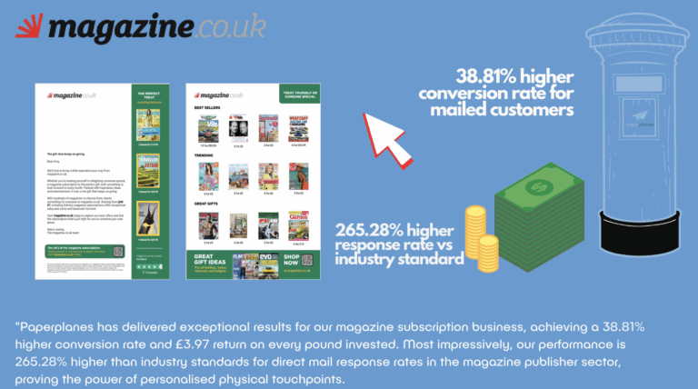The campaign delivered impressive results from July to September 2025, with mailed customers converting at a 38.81% higher rate than non-mailed cohorts, achieving a 9.68% overall conversion rate and generating £1,500 in total sales with an average basket value of £35. The abandoned basket 24-hour segment performed particularly well, converting at a 58.82% higher rate than controls with just a £9 CPA. The campaign achieved an exceptional £3.97 return for every £1 invested, whilst comparison to JICMail industry benchmarks revealed Magazine.co.uk’s direct mail performance was 265.28% higher than industry standard response rates and delivered 186.67% higher total order values, demonstrating that personalised direct mail significantly outperforms traditional addressed mail approaches in the magazine and newspaper publisher sector.