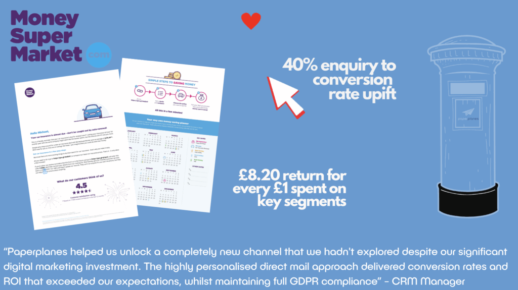 MoneySuperMarket is one of the UK’s leading price comparison platforms, enabling consumers to compare car insurance, home insurance, travel insurance, mortgages, credit cards, and loans online. Despite generating £330 million in 2017 and being one of the largest spenders in digital marketing, they had yet to utilise direct mail. Facing challenges from GDPR regulations and difficulty improving already strong performance from saturated online channels, they approached Paperplanes to understand how highly automated and personalised direct mail could add incremental value to their customer journeys, particularly for high-intent prospects who had shown interest but not yet converted.