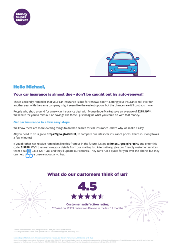Paperplanes partnered with MoneySuperMarket to identify key groups of home and motor insurance prospects ideal for direct mail follow-up. Predictive modelling was used to identify the most relevant segments for targeting, ensuring maximum efficiency and relevance. Highly personalised content was created to incentivise conversion, with customisation appearing on the front and back of letters as well as on envelopes themselves. Campaign performance was closely monitored by legal and customer service teams throughout to ensure GDPR compliance and address any potential customer concerns, establishing a framework for responsible use of this new channel.