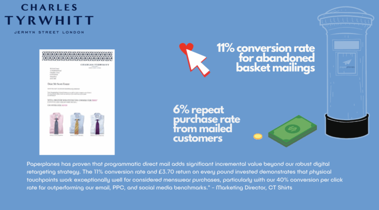 CT Shirts partnered with Paperplanes to identify online customers abandoning their baskets before purchasing, looking for those placing any of CT’s thousands of SKUs into their online baskets but not completing checkout. Customers who fell out of the conversion funnel were identified by Paperplanes technology and targeted with dynamically created, highly personalised content encouraging them to purchase with free delivery savings. The highly relevant and responsive content hit the print press the same day carts were abandoned, ensuring maximum relevance and timeliness for these high-intent menswear shoppers.