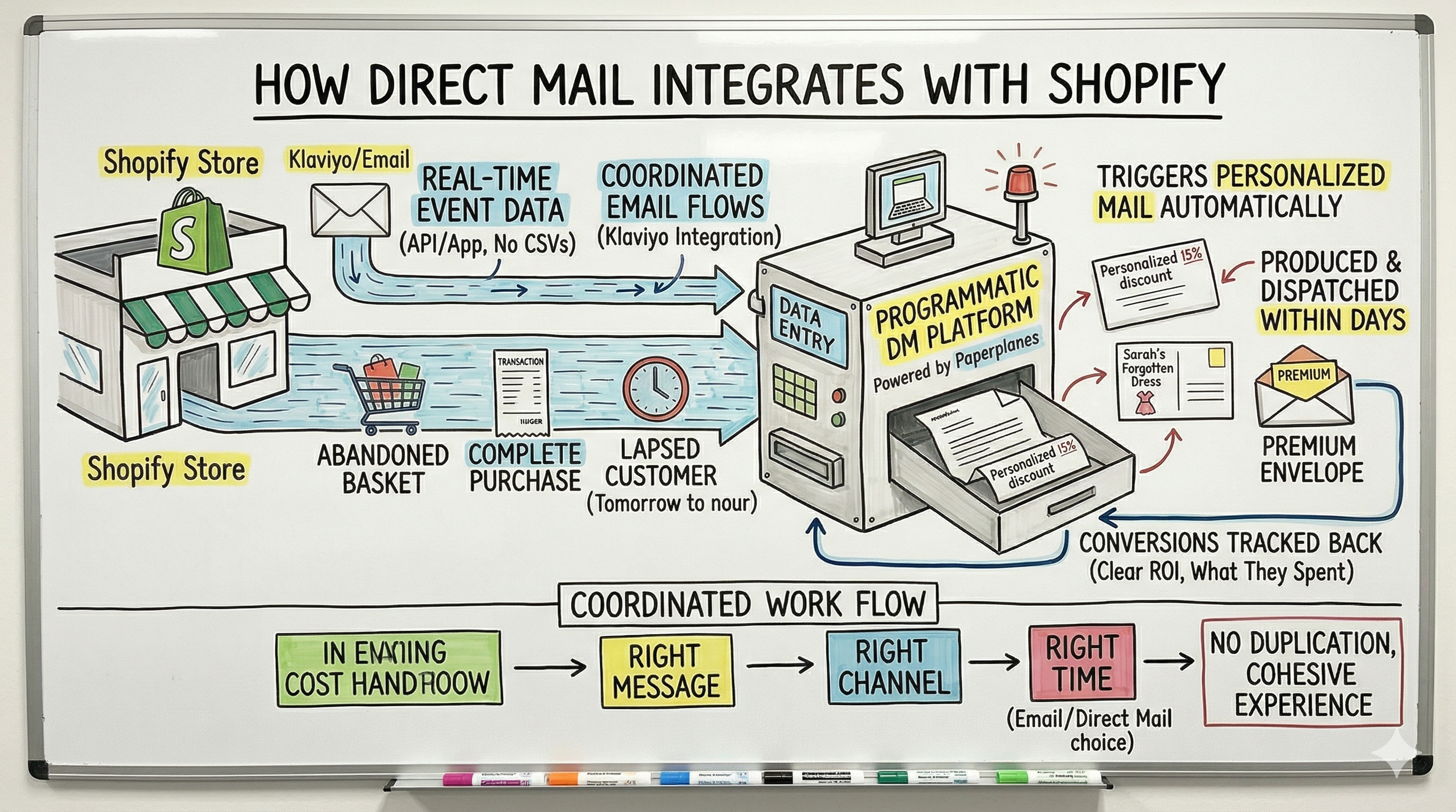 Modern programmatic direct mail platforms connect directly to your Shopify store via API or app integration. This means your customer data, product catalogue, and order history flow directly into the direct mail platform, no manual uploads, no CSV exports, no data lag.