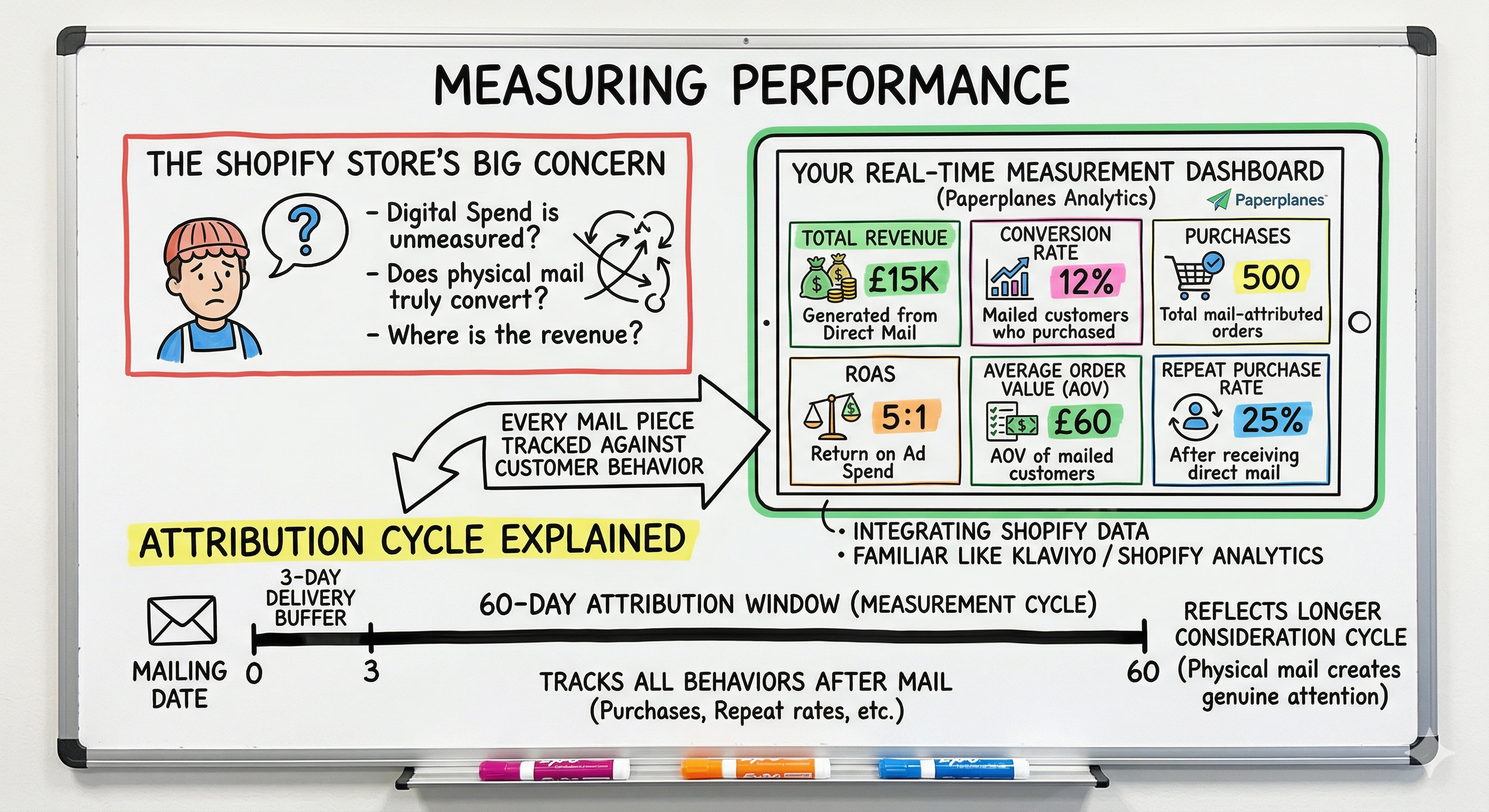 Because Paperplanes integrates directly with your Shopify data, every mail piece is tracked against the customer’s subsequent behaviour. You can see how many mailed customers went on to purchase, the total revenue generated, your conversion rate, ROAS, average order value, and repeat purchase rate, all in a real-time dashboard that feels familiar to anyone used to monitoring Klaviyo or Shopify analytics.