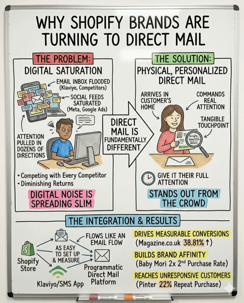 Direct mail offers something fundamentally different: a physical, personalised piece of communication that arrives in your customer’s home, commands real attention, and drives measurable conversions. And with modern programmatic direct mail platforms that integrate directly with Shopify, it’s now as easy to set up and measure as an email flow.