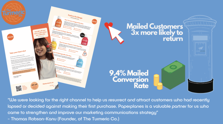 The Turmeric Co. offers its customers award-winning turmeric-based wellness shots, delivered in fully recyclable, insulated packaging. With 15 years of experience in crafting world-class blends, the functional nutrition brand offers a range of versatile shots to allow customers to tailor subscriptions suited to their needs. To enhance the customer experience even further, The Turmeric Co. is partnering with Paperplanes to test the programmatic direct mail strategy. In order to see if mailing can lead to higher retention rates, this test is focused on triggering relevant, personalised, physical media to customers who have recently ‘fallen out’ of the basket process. A reactivation strategy will also be tested to complement this. The overarching goal is to understand if a physical piece of mail landing in-home would create long-term engagement, greater levels of spend and an increased frequency of purchase.
