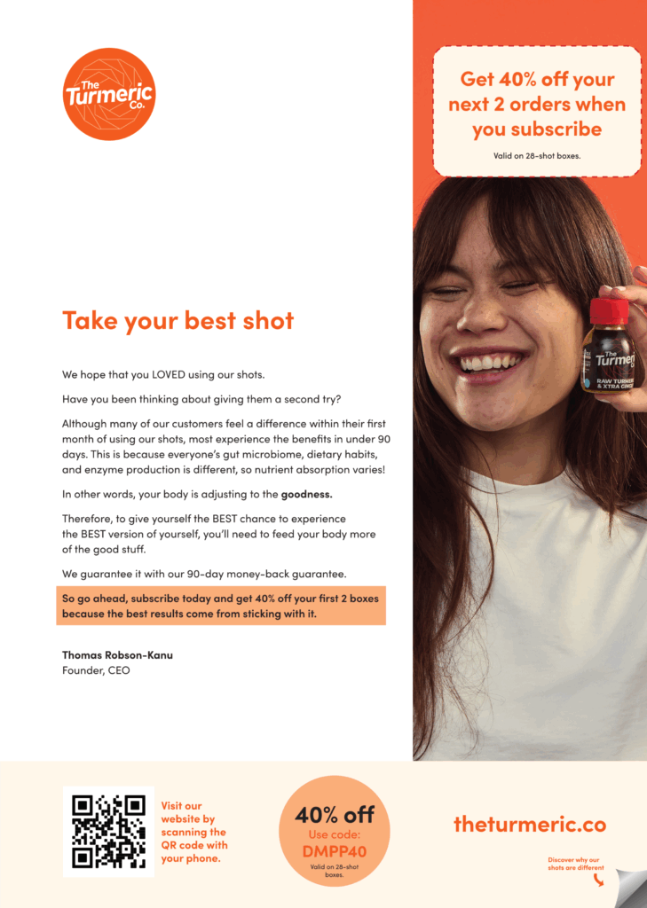 Paperplanes worked closely with the CRM and Growth teams at The Turmeric Co., to understand where we could add the most value. We decided to target customers who ‘fell out’ of the basket process by sending postal marketing both including and excluding a discount code of 15%. We segmented creatives further to highlight whether a customer returns to the website to make a purchase, and introduced other A/B tests to refine and optimise our approach based on the information captured across the site via our tech integration.