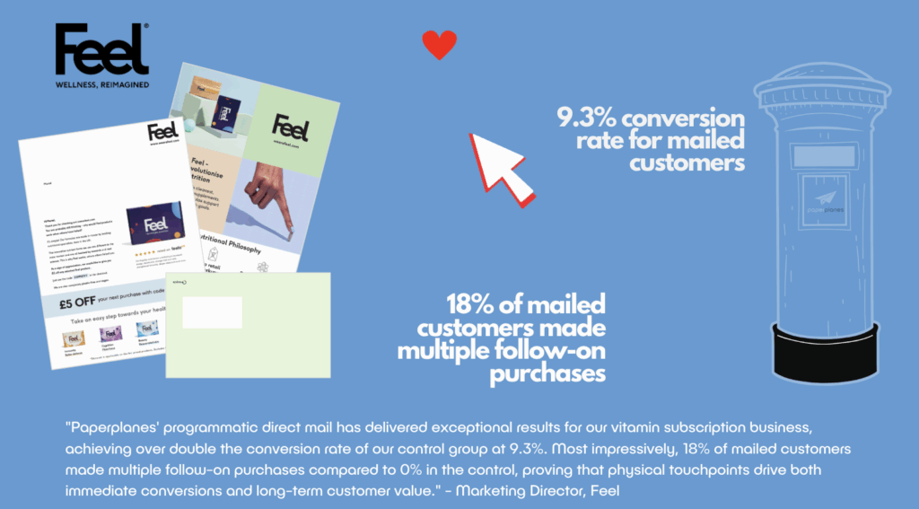 Feel partnered with Paperplanes and PSE to launch a programmatic direct mail pilot in April 2021, targeting customers who had fallen out of the basket process to test whether physical mail could create long-term engagement, greater spend, and increased purchase frequency. The campaign featured simple, focused creative reflecting Feel’s overall brand mission with personalisation in the greeting using customers’ first and last names, deployed as A4 letters with branded outer envelopes. The strategy included discount code incentives whilst employing sophisticated tracking technology to capture all mailed customer conversions on-site, not just those who entered codes, providing full visibility of campaign impact beyond traditional code redemption tracking.